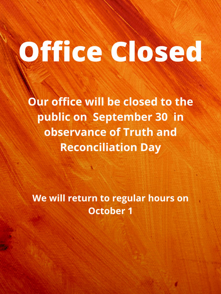We are closed September 30 in order to commemorate the National Day of Truth and Reconciliation. We look forward to serving you again on October 1.