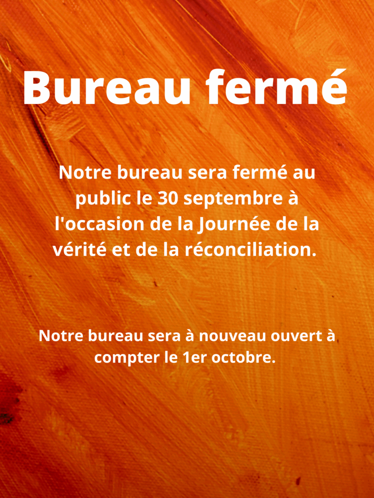 Nous serons fermés le 30 septembre afin de souligner la Journée nationale de la vérité et de la réconciliation. Nous serons de retour pour vous servir le 1er octobre.